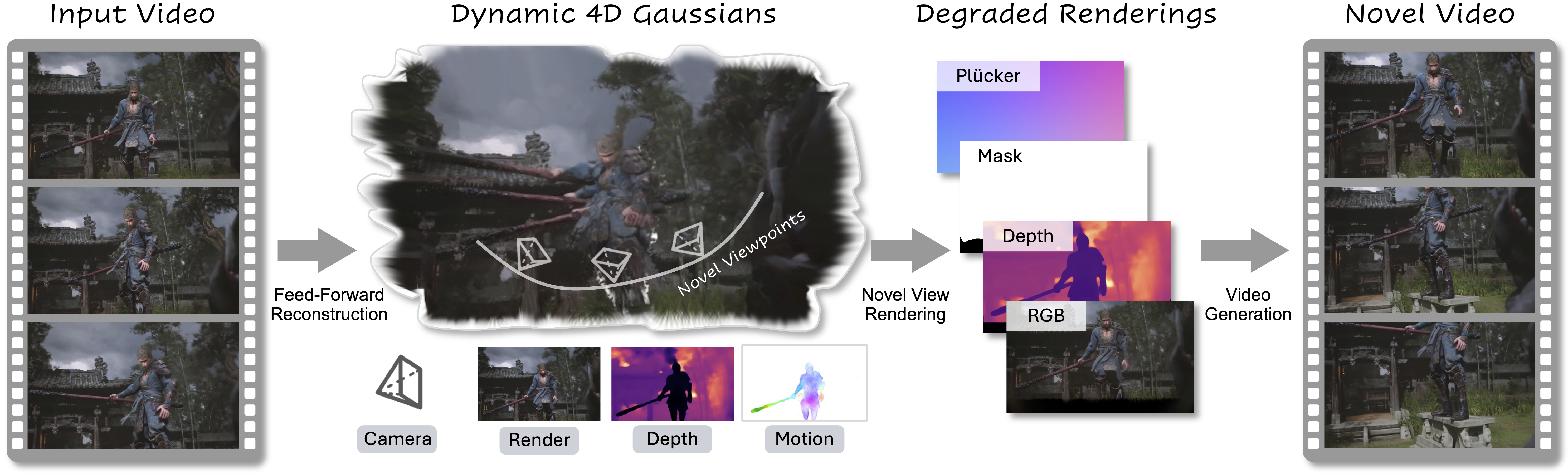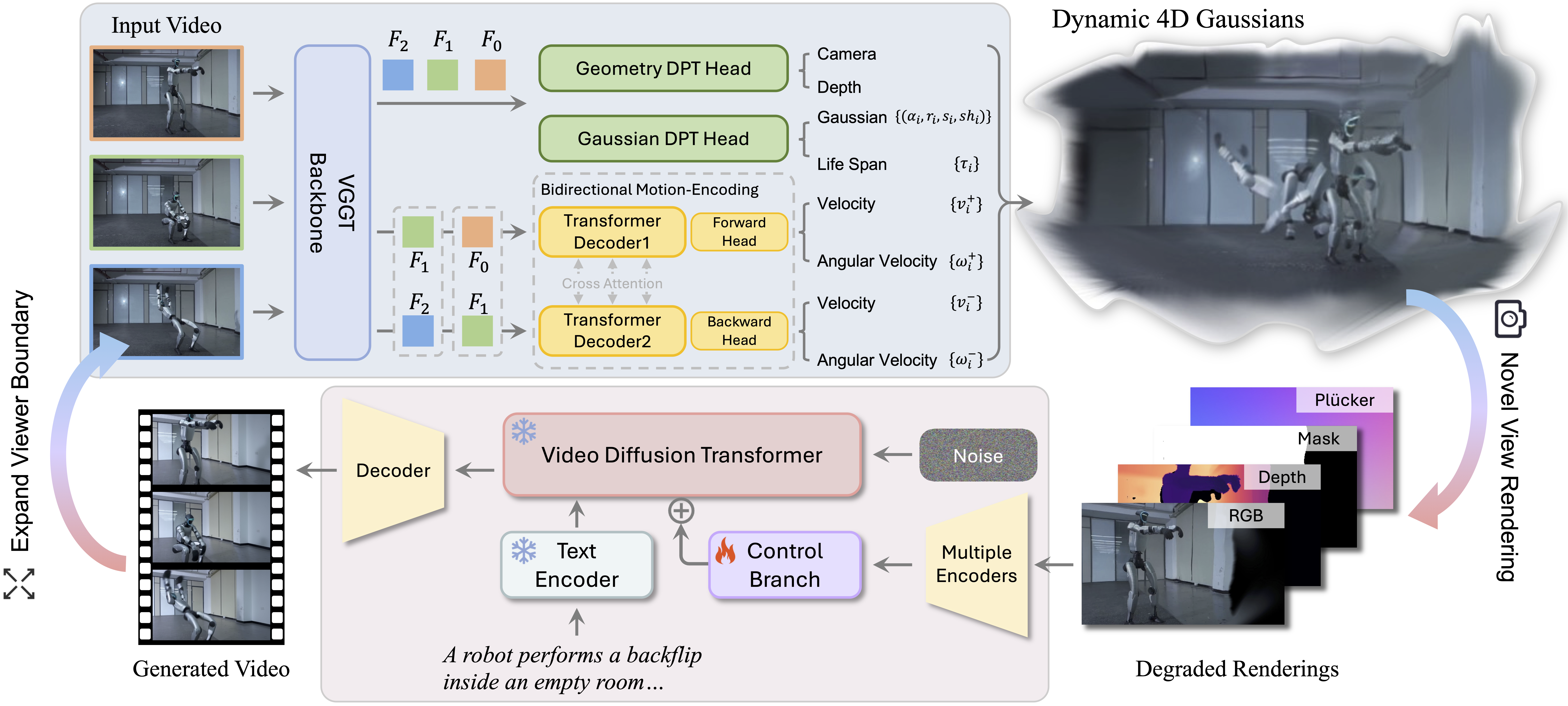 Framework of NeoVerse. In the reconstruction part, we propose a pose-free feed-forward 4DGS reconstruction model with bidirectional motion modeling. The degraded renderings in novel viewpoints from 4DGS are input to the generation model as conditions. During training, the degraded rendering conditions are simulated from monocular videos, and the original videos themselves serve as targets.